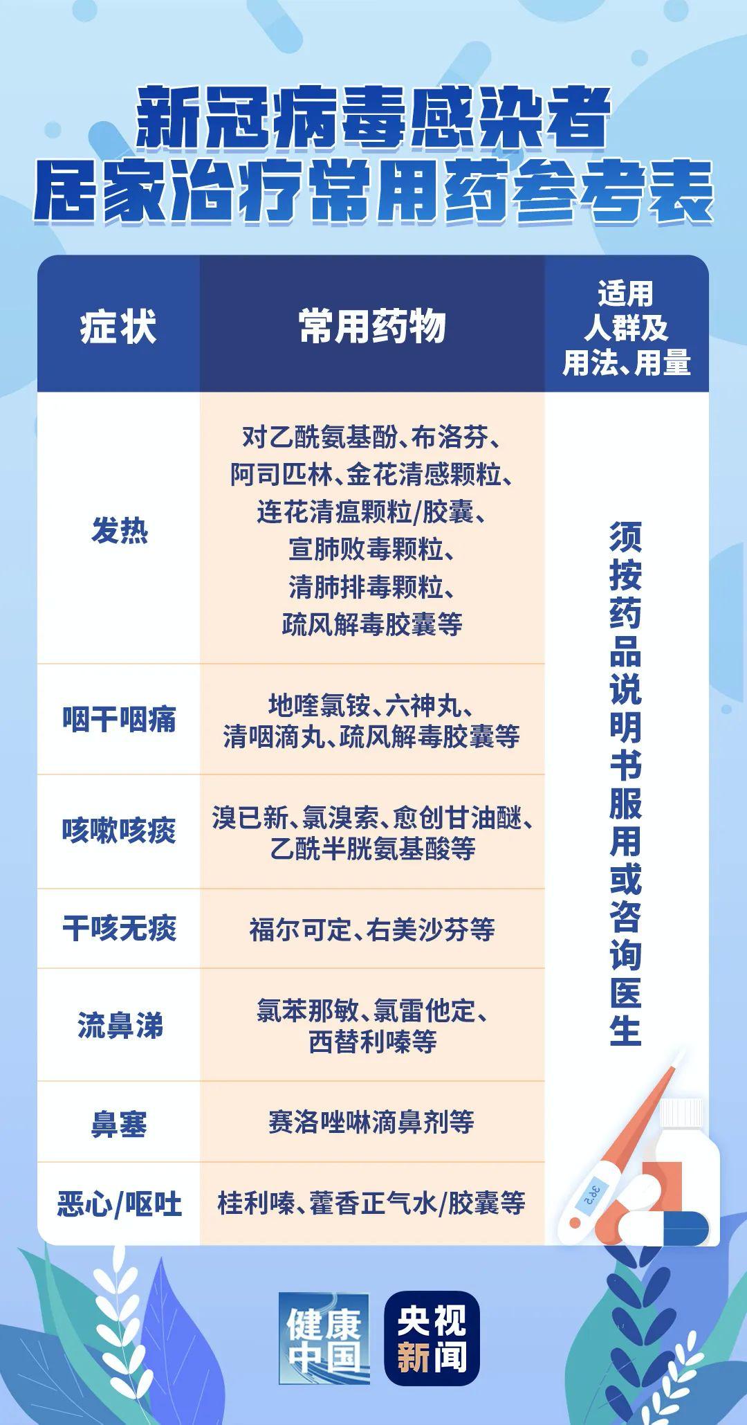 ????????12月8日,央視網(wǎng)轉(zhuǎn)載國家衛(wèi)健委官網(wǎng)發(fā)布新冠感染者居家治療指南。針對可以居家治療的新冠病毒感染者可能出現(xiàn)的7種癥狀推薦了家庭常用參考藥物。圖表如下:
